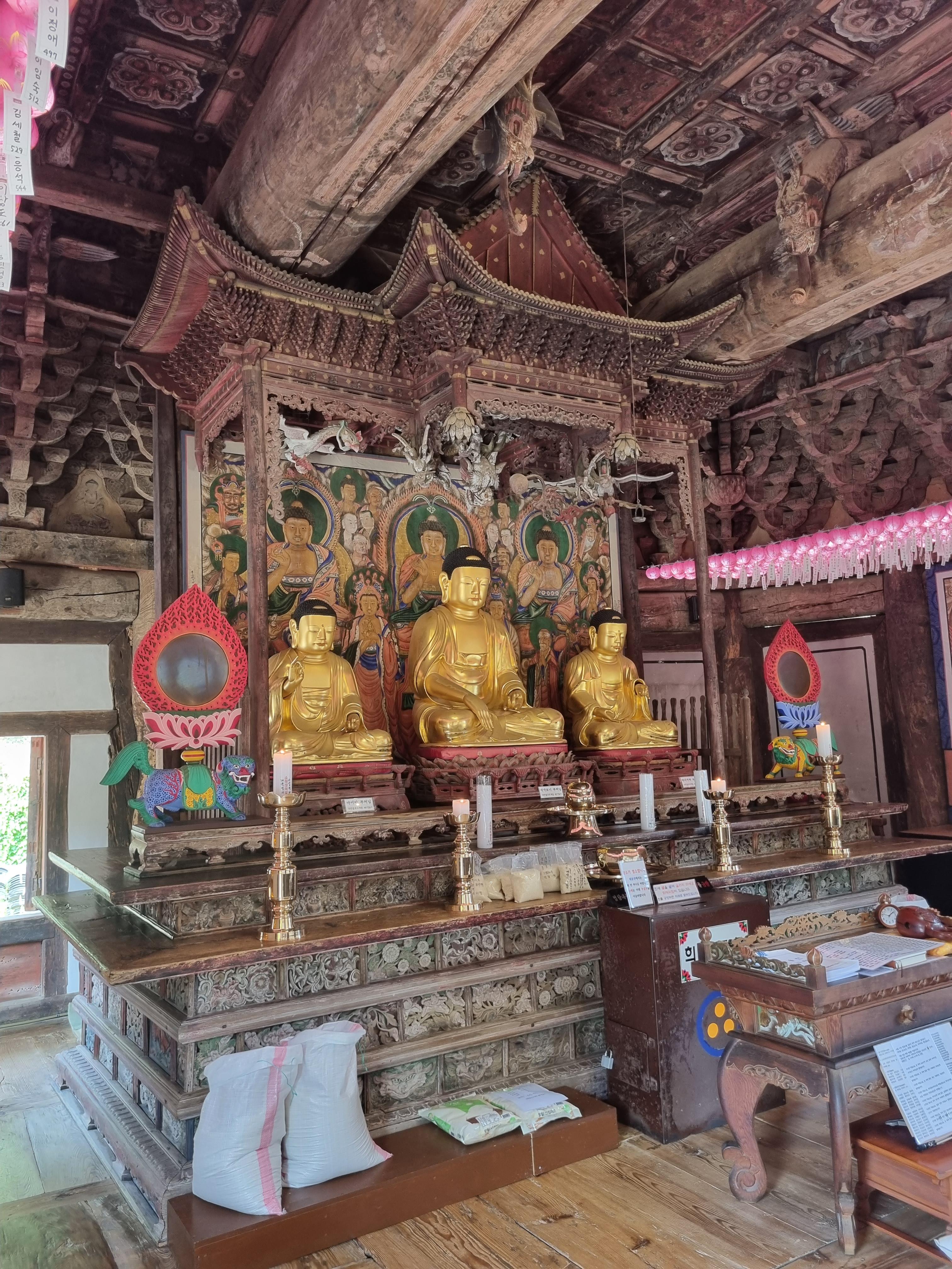 대웅전 목조석가여래삼존불 보물이 위치해 있더라구요.